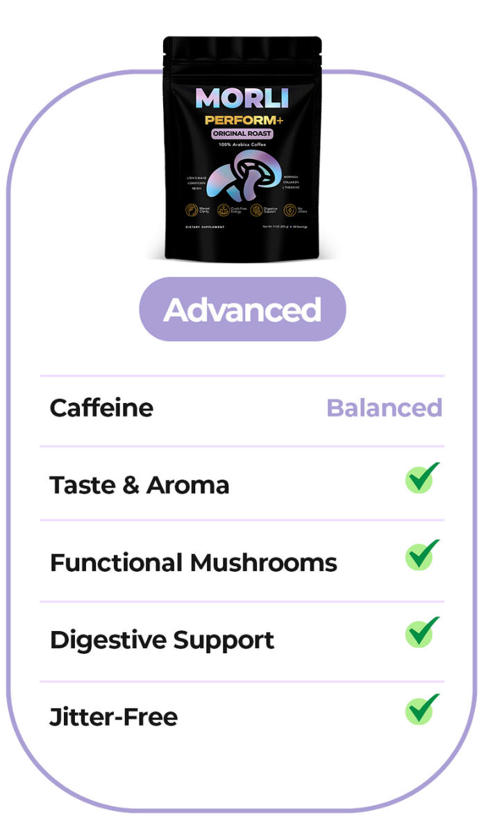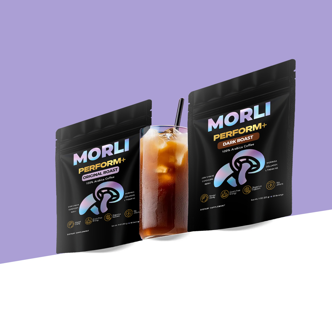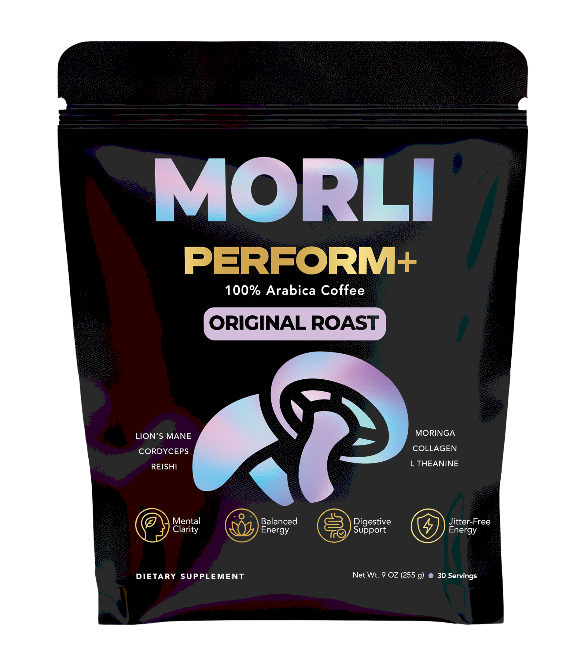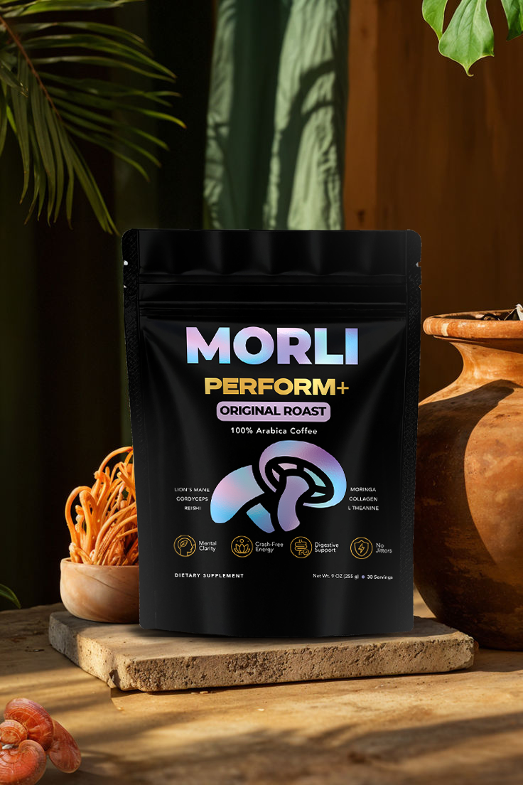 MORLI PERFORM+ is a refined mushroom coffee made for calm energy and clear focus. Enjoy the coffee ritual you love without jitters, crashes, or a mushroom aftertaste.
